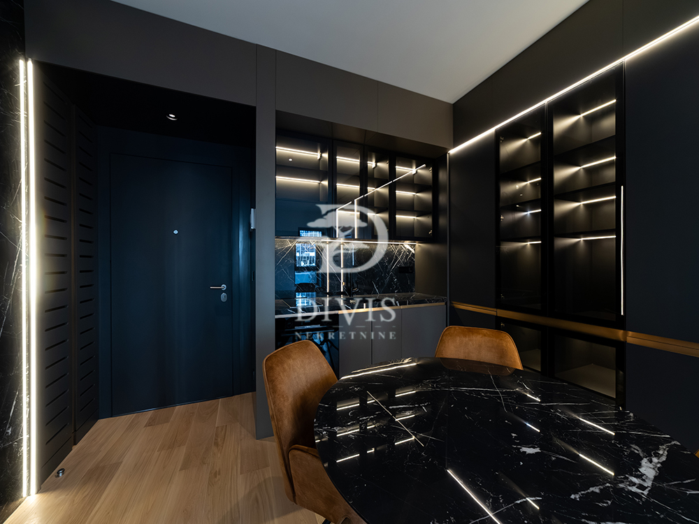 Stan odlikuje izuzetno funkcionalan raspored: prostrana dnevna zona sa velikim staklenim površinama obezbeđuje obilje prirodne svetlosti, dok je kuhinja luksuzno renovirana i opremljena kvalitetnom belom tehnikom. Trpezarijski deo prirodno je povezan sa dnevnim boravkom, a komforna spavaća soba, moderno kupatilo i praktična tehnička prostorija dodatno podižu nivo komfora. Stan je trenutno polunamešten i opremljen pažljivo biranim materijalima, a posebnu vrednost pruža velika terasa sa lepim pogledom ka Kuli Beograd.