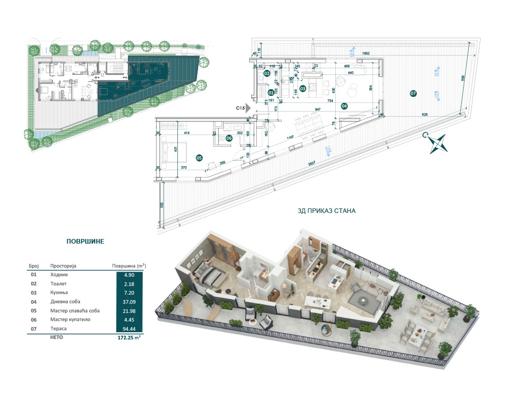 Ono što ovaj stan realno izdvaja je terasa površine 94,44 m², koja pruža ogroman potencijal za uređenje — lounge zona, letnja trpezarija, zelenilo, privatni kutak za odmor ili rad na otvorenom. Neto unutrašnja površina stana je 77,81 m², pa ukupno sa terasom stan ima 172,25 m².