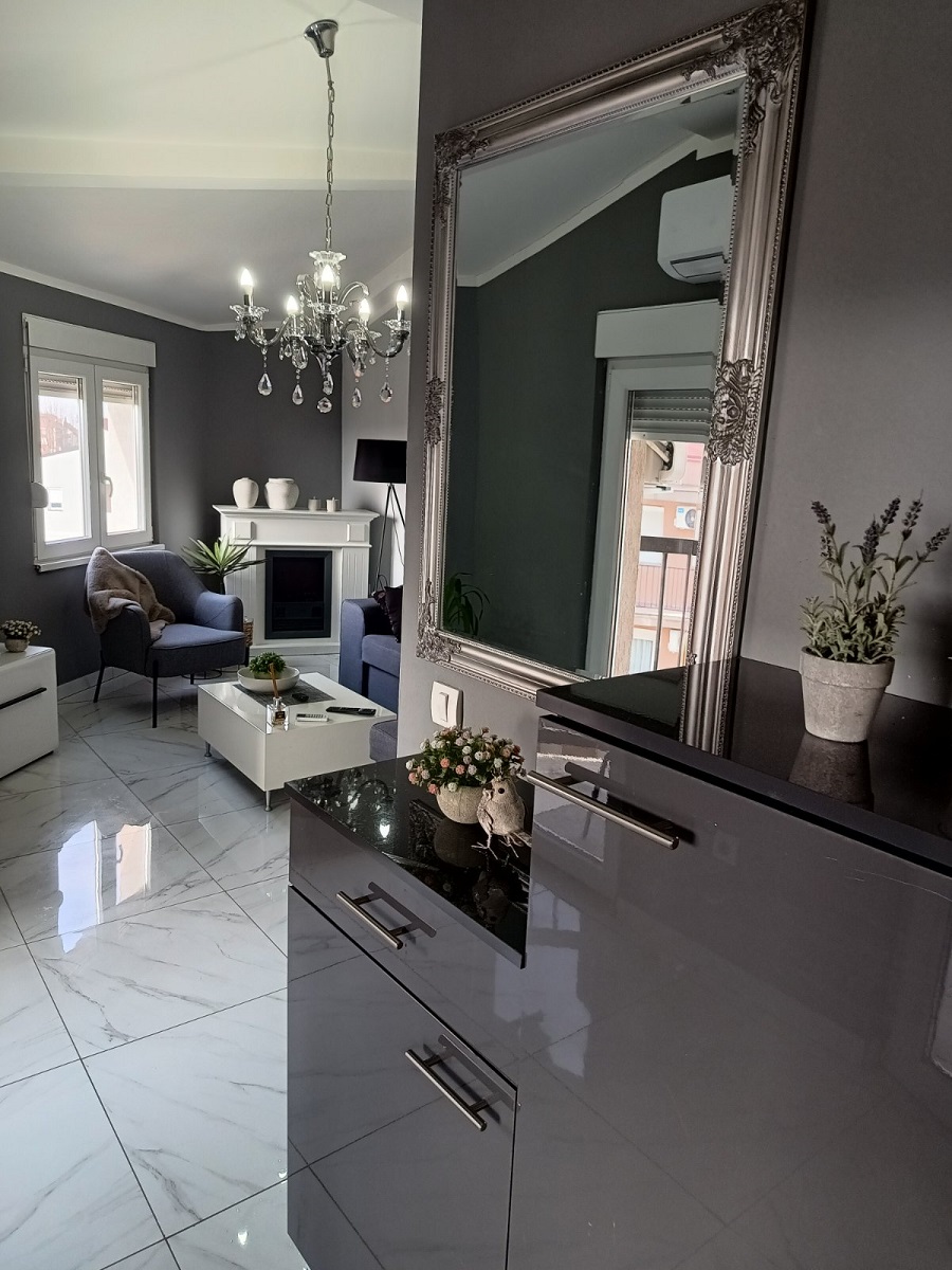 Stan je pažljivo uređen sa posebnim akcentom na estetiku i funkcionalnost. Sastoji se od prostranog dnevnog boravka povezanog sa trpezarijom i kuhinjom, spavaće sobe, kupatila i terase. Enterijer je luksuzno namešten, sa modernim nameštajem i kvalitetnim materijalima.