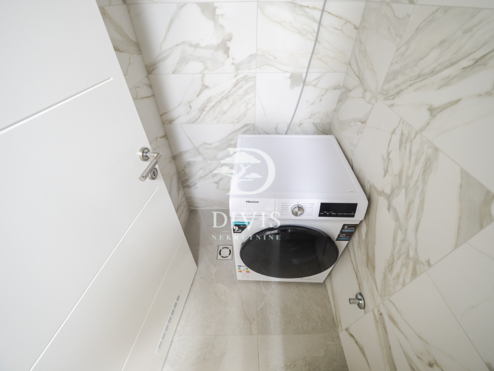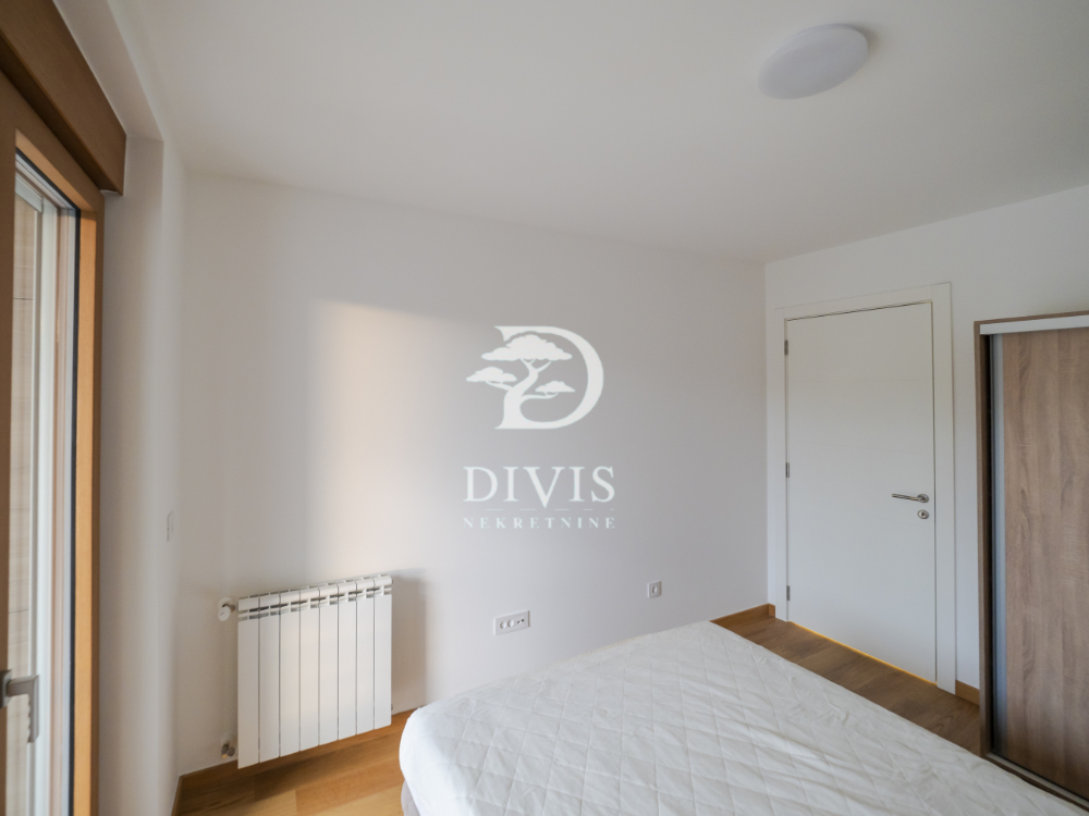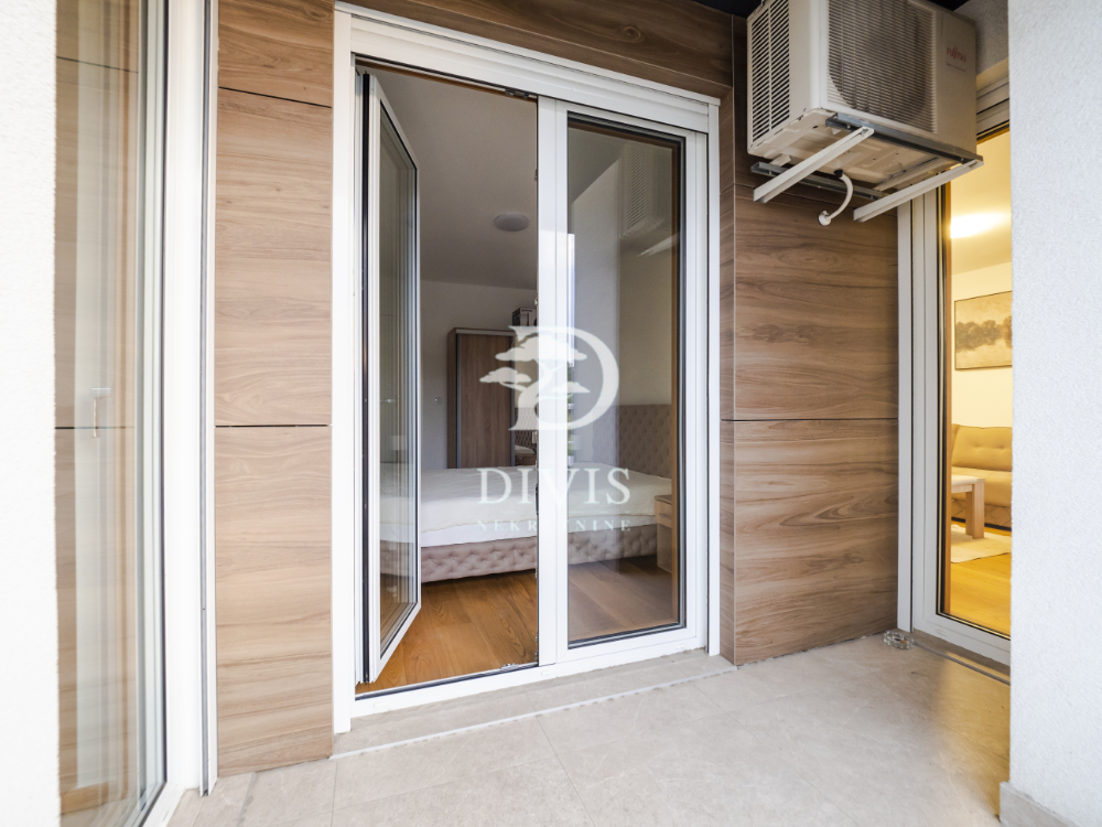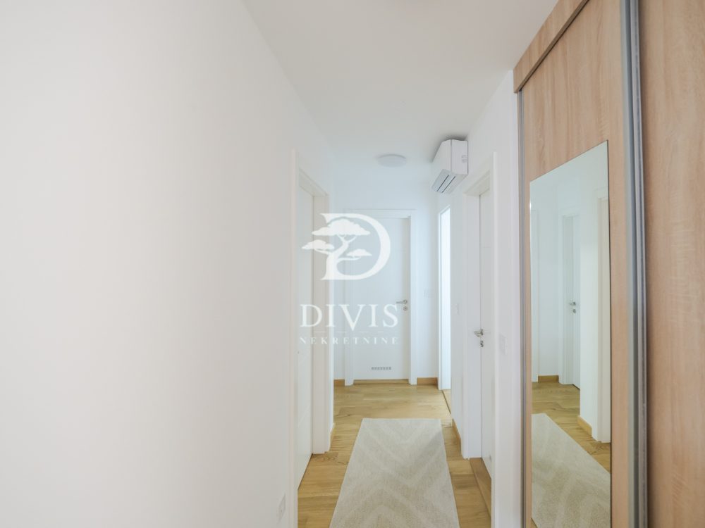 Sastoji se od ulaznog hodnika, velikog dnevnog boravka sa kuhinjom i trpezarijom, dve spavaće sobe, kupatila i posebnog WC-a. Iz sve tri prostorije postoji izlaz na terasu. Stan je luksuzno opremljen i odmah useljiv, sa svim uređajima i nameštajem visokog kvaliteta.