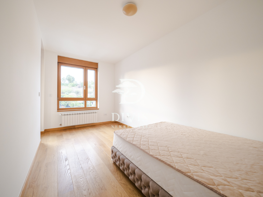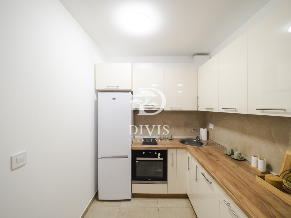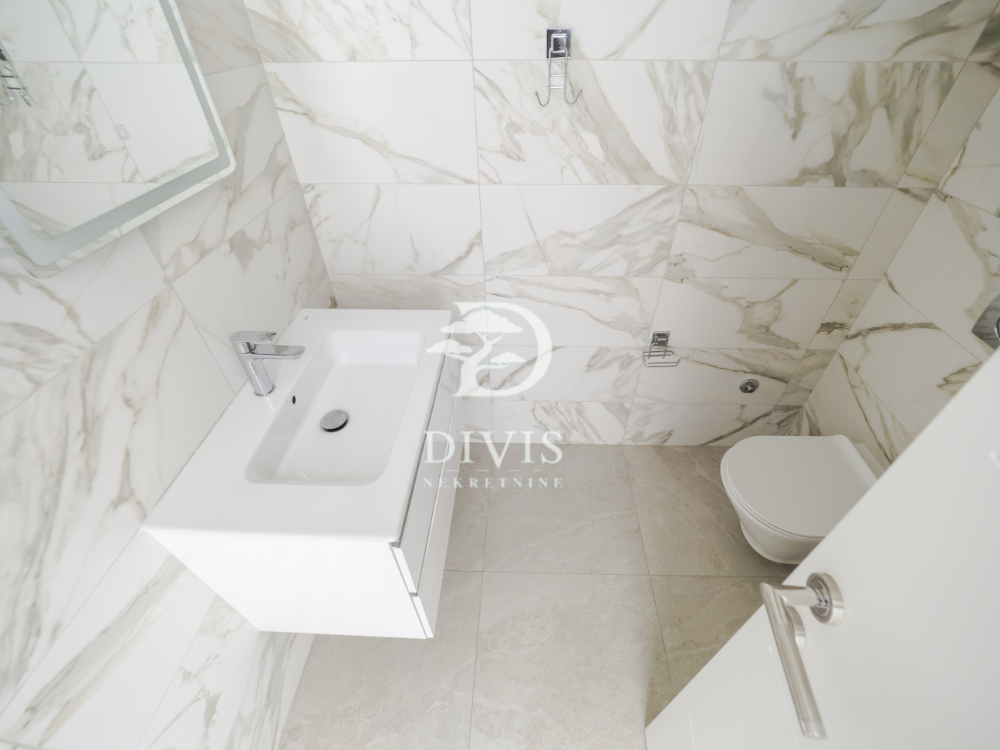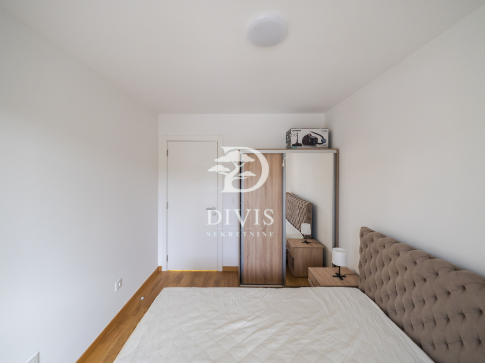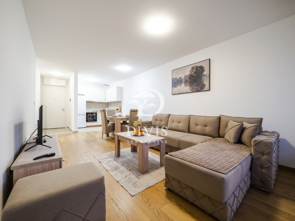 Sastoji se od ulaznog hodnika, velikog dnevnog boravka sa kuhinjom i trpezarijom, dve spavaće sobe, kupatila i posebnog WC-a. Iz sve tri prostorije postoji izlaz na terasu. Stan je luksuzno opremljen i odmah useljiv, sa svim uređajima i nameštajem visokog kvaliteta.