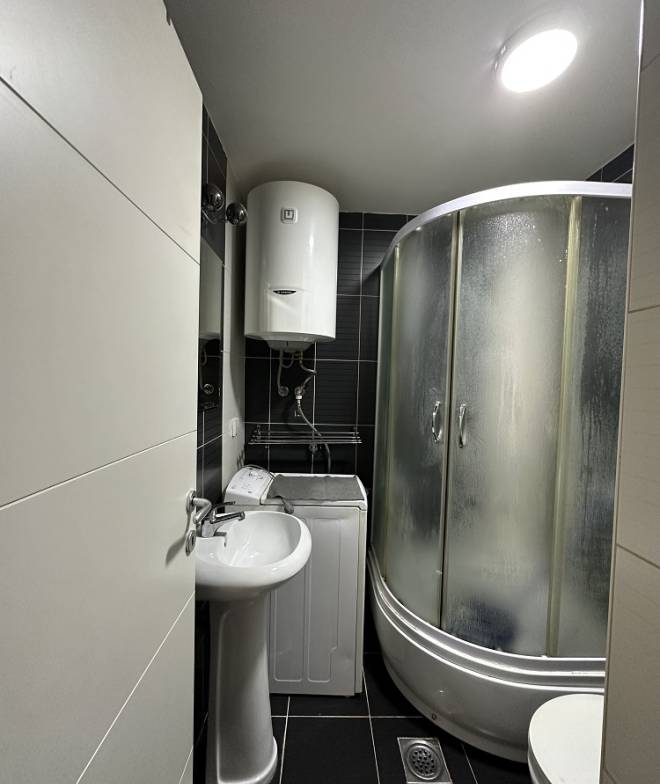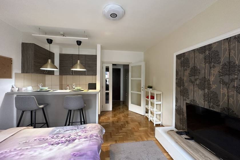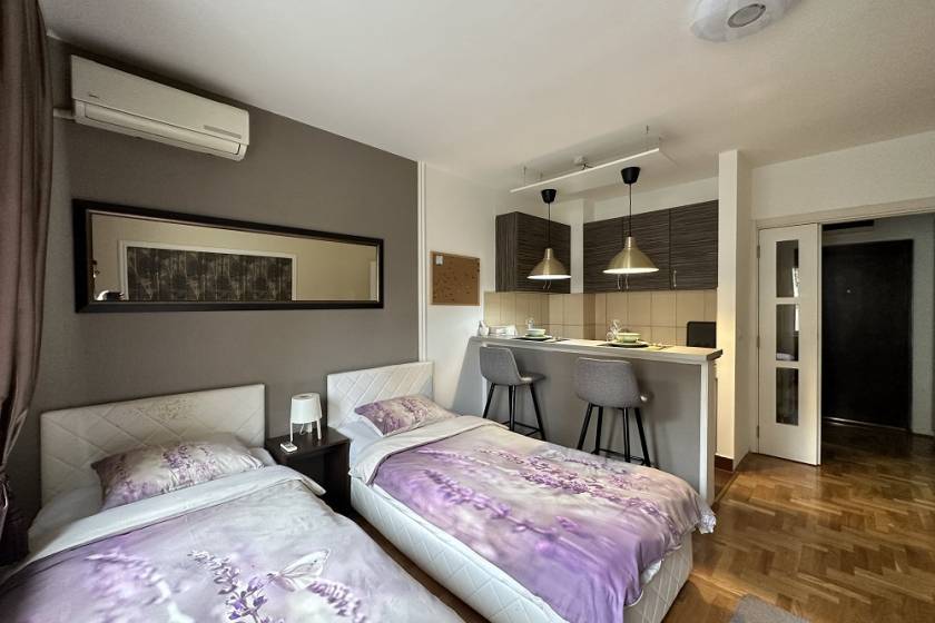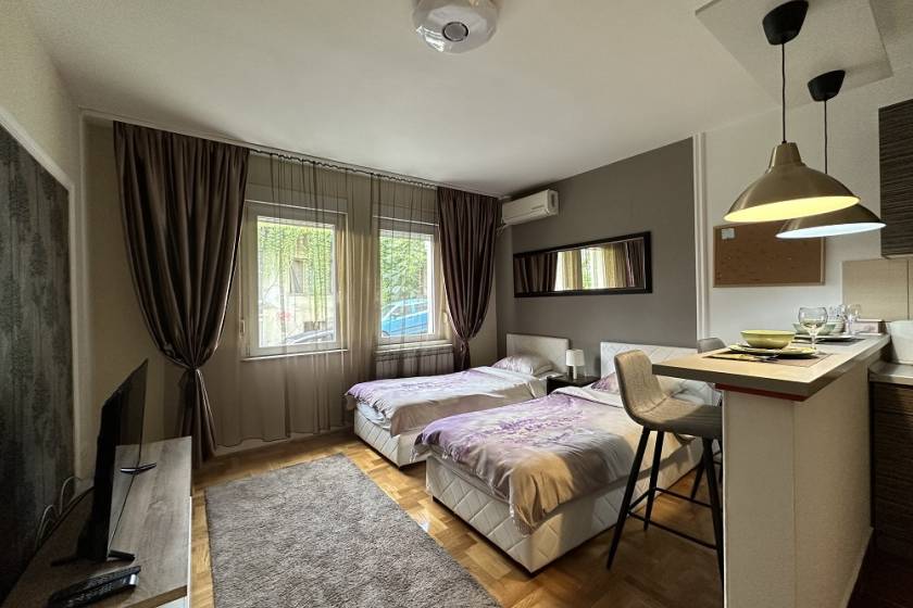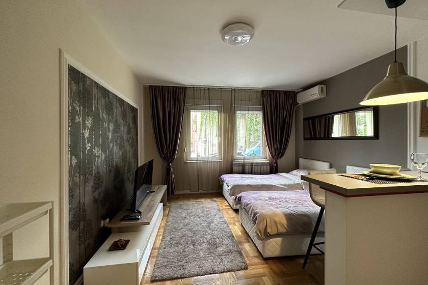 Sastoji se od ulaznog hodnika, dnevnog boravka sa kuhinjom i trpezarijom i kupatila. Stan je potpuno sređen i opremljen svim stvarima potrebnim za lagodan život.