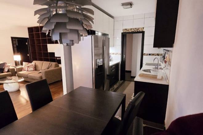Sastoji se od prostranog dnevnog boravka, tri spavaće sobe, kuhinje sa trpezarijom, kupatila, toaleta i terase. Stan je kompletno namešten, opremljen kvalitetnim nameštajem i tehnikom, i u odličnom je stanju. Svetao, funkcionalnog rasporeda, idealan za porodično stanovanje ili poslovne ljude.