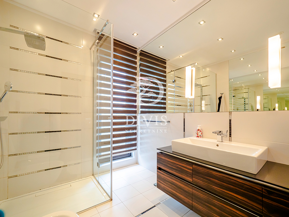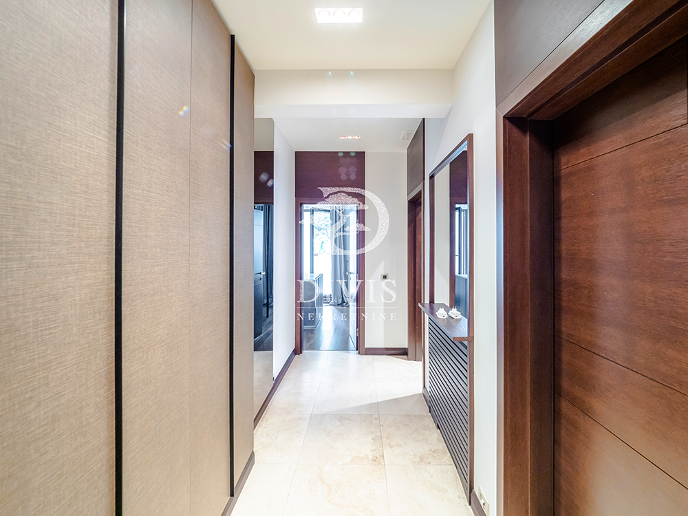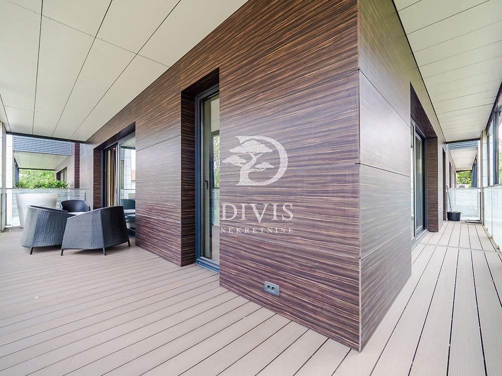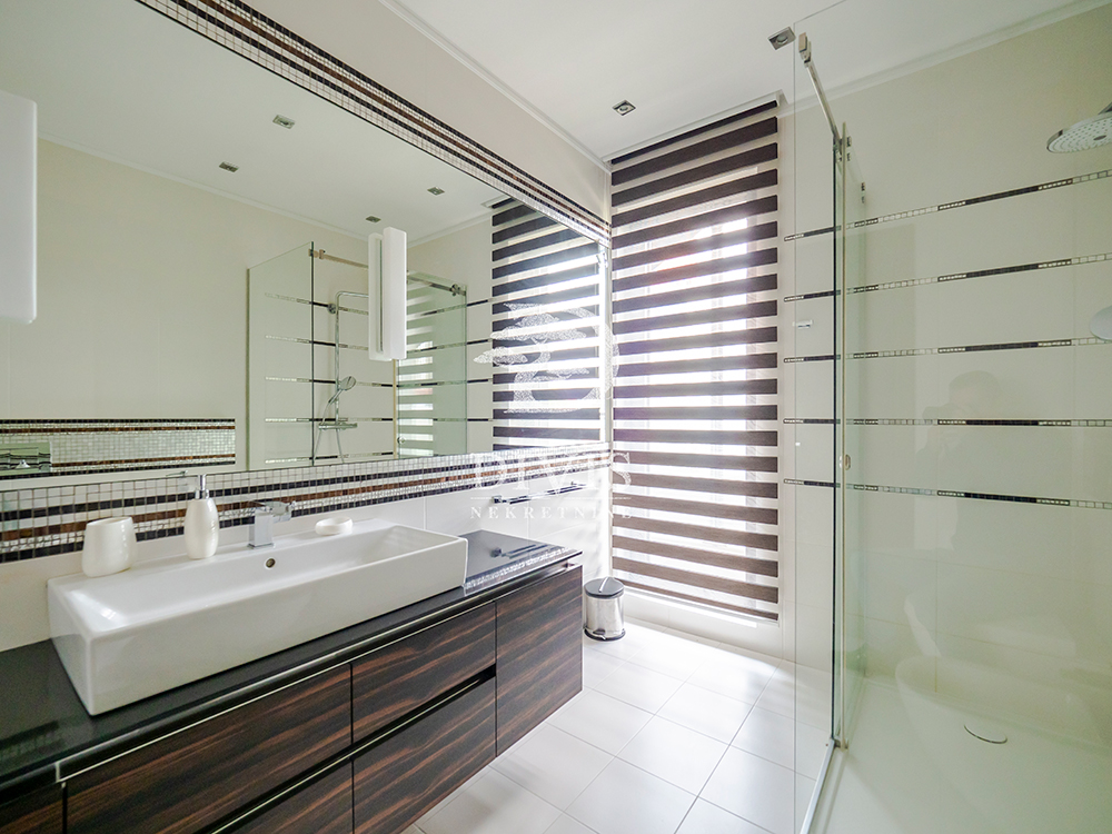 Stan je podeljen u dve zone (dnevna i spavaća). Dnevna se sastoji od velikog dnevnog boravka sa izlazom na veliku terasu, prostrane kuhinje, dela za trpezariju, velikog garderobera i gostinskog toaleta. Spavaća zona se sastoji od hodnika, tri prostrane spavaće sobe (svaka soba ima svoje kupatilo), ugradnih plakara. Iz svake spavaće sobe se izlazi na terasu.Na podu terasa je decking pod dok je terasa natkrivena žaluzinama. Visina plafona od 2.85m.