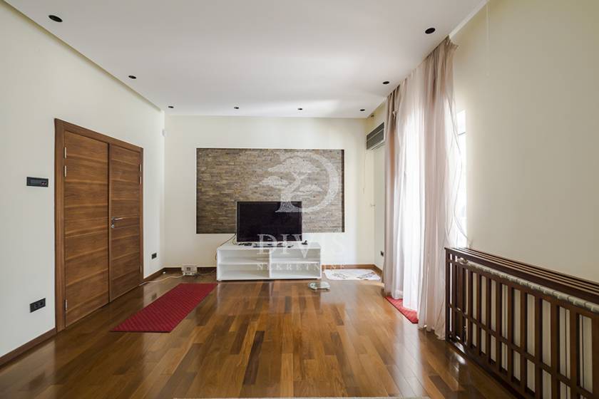 Kuća je trostrano orijentisana i organizovana na četiri nivoa: suteren, prizemlje i sprat. Prizemlje čine predsoblje, prostran dnevni boravak sa izlazom na verandu i bazen, kuhinja i velika trpezarija sa mogućnošću formiranja dodatne spavaće sobe i izlazom na terasu površine 21 m2, kao i kupatilo. Na spratu se nalaze četiri spavaće sobe, od kojih dve imaju izlaz na terasu, i kupatilo.