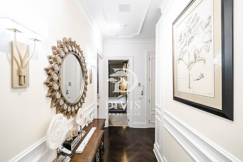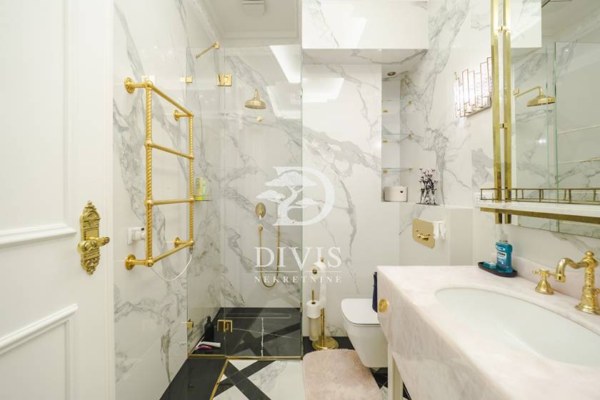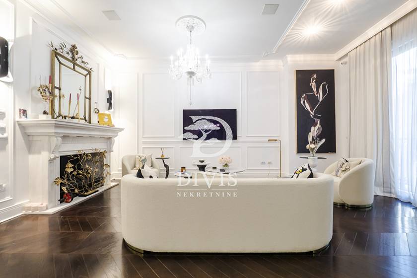 Sastoji se od ulaznog hodnika, prostranog dnevnog boravka sa kuhinjsko-trpezarijskim delom i izlazom na dve terase, dve spavaće sobe od toga je jedna sa francuskim balkonom, kupatila i gostinskog toaleta. Opremljen luksuznim uvoznim nameštajem. Italijanska keramika veoma visokog kvaliteta, hrastov parket iz uvoza S klase. Sedmokomorna spoljna stolarija aluminijum drvo, sigurnosna ulazna vrata, američki plakari u spavaćem delu, Miele bela tehnika u kuhinji. Stan je opremljen kamerama, alarmnim i protivpožarnim sistemom. Visina plafona 3,2m.