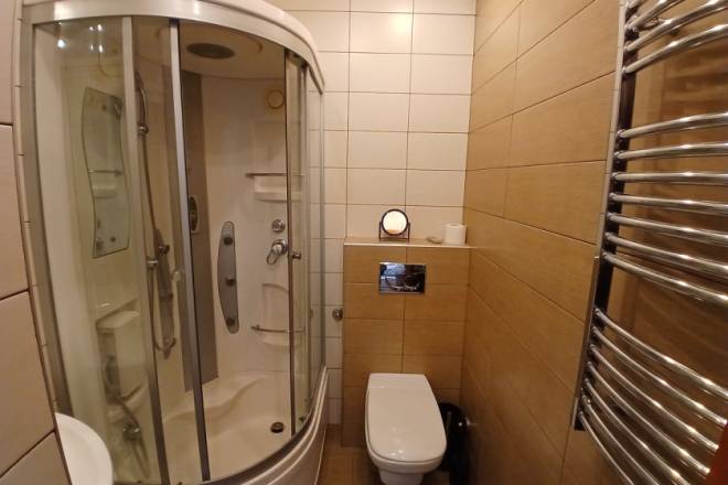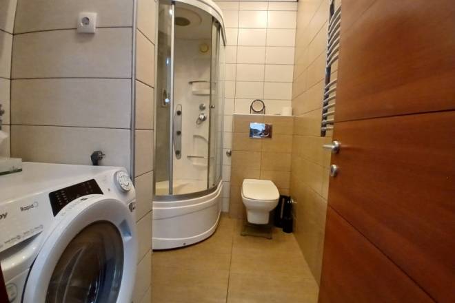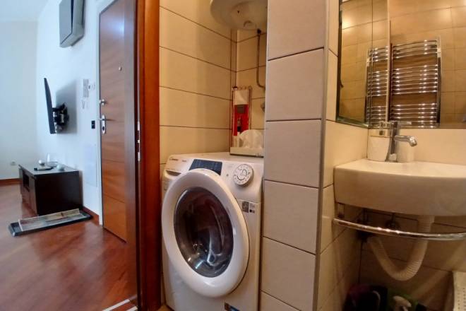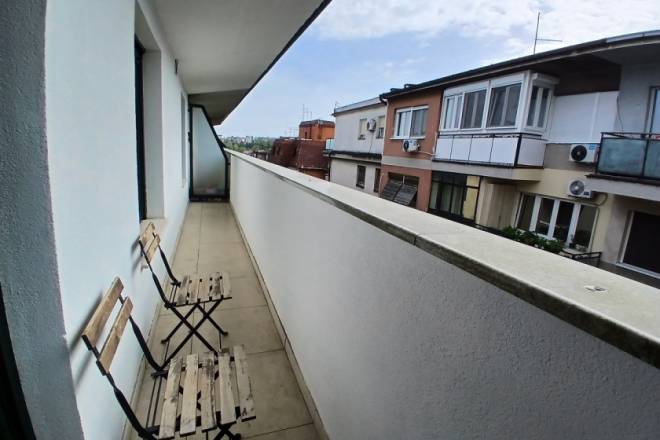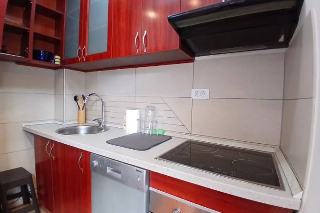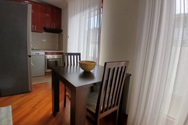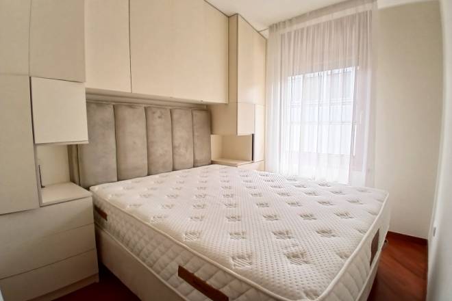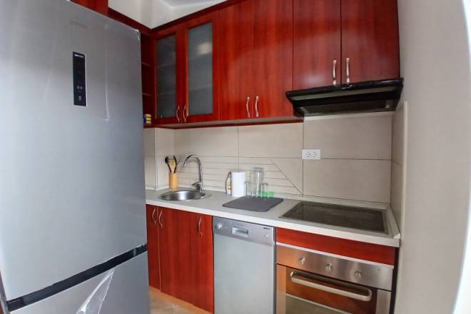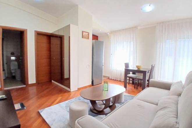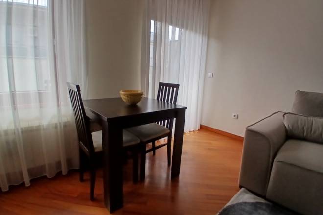Raspored uključuje i odvojenu spavaću sobu, kao i funkcionalno kupatilo. Stan je kompletno namešten, očuvan i odmah useljiv. Dodatna pogodnost je mogućnost zakupa natkrivene garaže, kojoj se pristupa kroz poseban ulaz sa kontrolisanim pristupom, namenjen isključivo stanarima. Cena garažnog mesta iznosi 100 € mesečno.