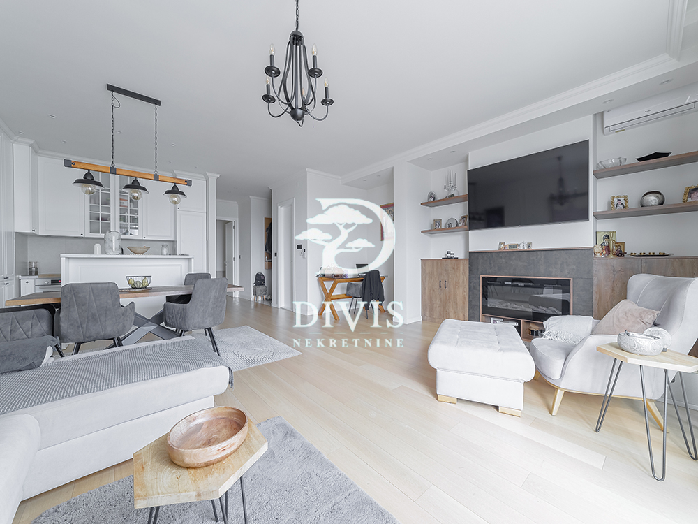 Ovaj luksuzni stan ima ukupnu površinu od 138m2, prostran dnevni boravak sa kuhinjom i trpezarijom, master sobu sa walk-in garderoberom i kupatilom, dve dečije sobe, kupatilo, gostinjski toalet, ostavu, posebnu prostoriju za mašine za veš i 2 terase. Prodaje se kompletno opremljen i namešten. Kuhinja je radjena po meri kao i sve u stanu od ugradnog nameštaja.