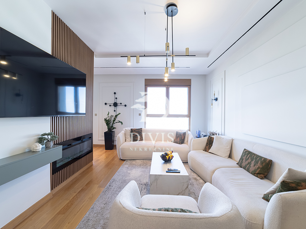 Sastoji se od ulaznog dela i prostranog openspace koncepta sa modernom kuhinjom i dnevnim boravkom, odvojenim trpezarijskim delom i izlazom na prostranu terasu. Drugi deo stana čini spavaći blok, od kojih je jedna master soba sa sopstvenim garderoberom i kupatilom sa podnim grejanjem. Poseduje još dva kupatila sa kadom i tuš kabinom, gostinjski toalet, tehničku prostoriju i ostavu. Opremljen najmodernijim nameštajem i uvoznim materijalima iz Španije i Italije. Sve prostorie su prostrane sa walk in garderoberom i sve poseduju inverter klimu. Najmodernija rasveta i Livolo prekidači su postavljeni u celom stanu.