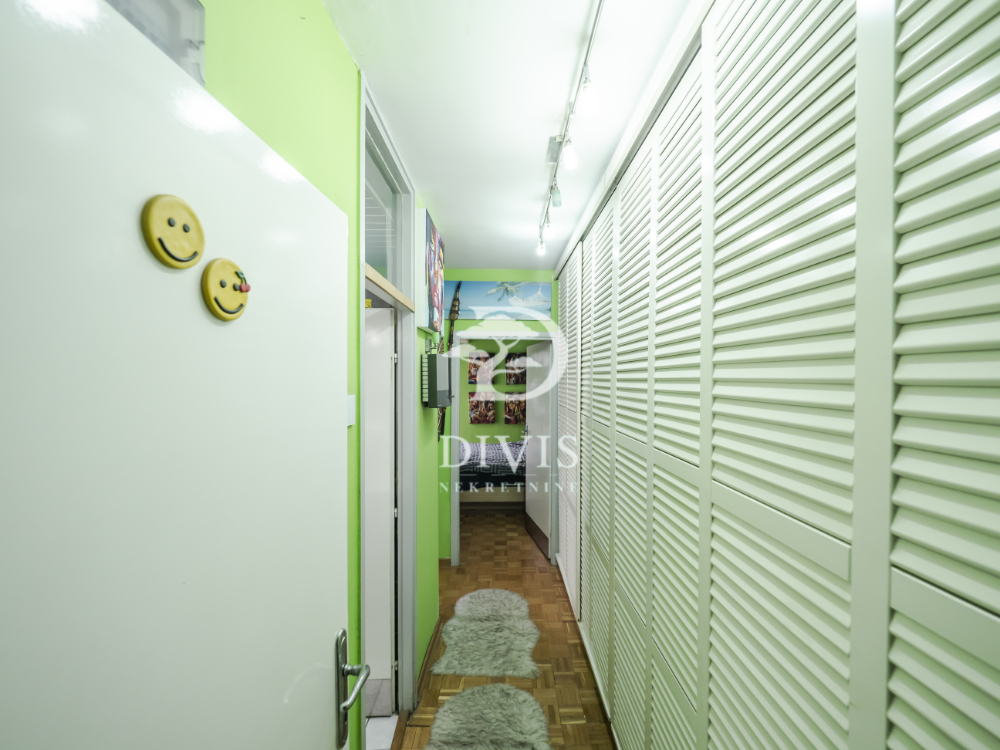 Raspored prostorija je funkcionalan i udoban: dve spavaće sobe, kuhinja sa trpezarijom, dnevna soba, kupatilo i odvojena vešernica. Nekadašnja velika terasa delimično je pretvorena u stambeni prostor, čime je dobijena dodatna kvadratura i praktičniji raspored.