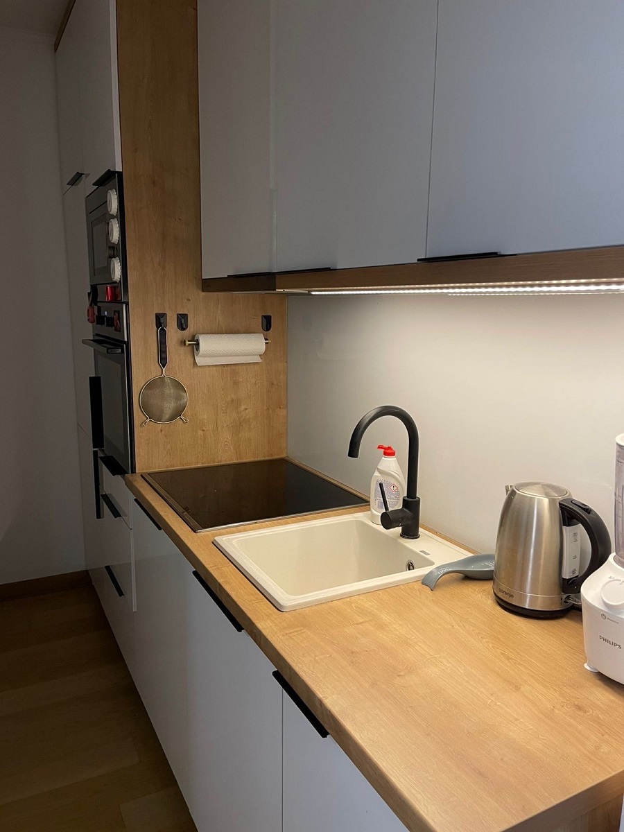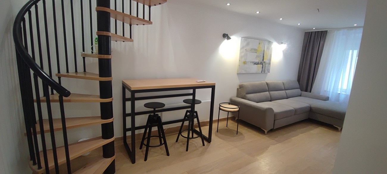 Izvorno manji salonac, stan je sada pretvoren u moderan dupleks. Na prvoj etaži nalaze se dnevni boravak, odvojena kuhinja i kupatilo, dok je druga etaža osmišljena kao spavaća soba.