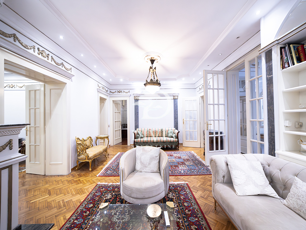 Odlikuje se autentičnim salonskim rasporedom koji obuhvata ulazni hodnik, veliki dnevni boravak sa kaminom, dve spavaće sobe sa izlazom na balkon, malu devojačku sobu, odvojenu kuhinju, ostavu, kupatilo i toalet. Stan je delimično renoviran, tom prilikom su zamenjene elektro instalacije, a grejanje je centralno.