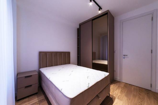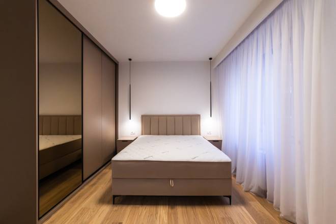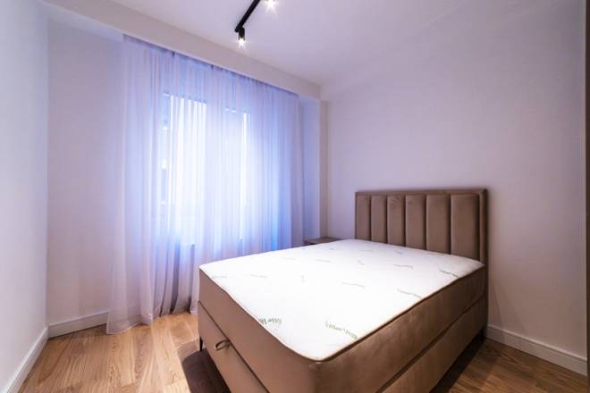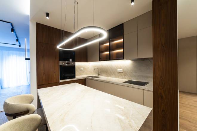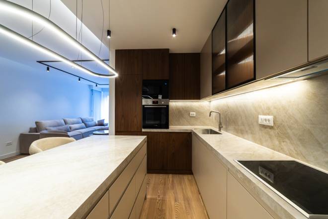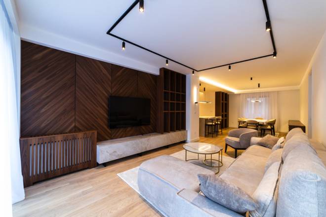 Stan ima prostran i svetao dnevni boravak povezan sa trpezarijom i moderno opremljenom kuhinjom sa vrhunskim aparatima, kao i tri spavaće sobe, od kojih je jedna master spavaća soba sa sopstvenim kupatilom. Pored toga, stan poseduje još jedno kupatilo i toalet, kao i funkionalni hodnici sa dovoljno prostora za odlaganje. Stan je u potpunosti opremljen nameštajem i tehnikom visokog kvaliteta, sa pažljivo biranim materijalima, toplim drvenim tonovima i savremenim osvetljenjem koje dodatno naglašava eleganciju i udobnost prostora. Uz stan dolazi garažno mesto uključeno u cenu, a zgrada je nova, sa urednim ulazom i liftom.