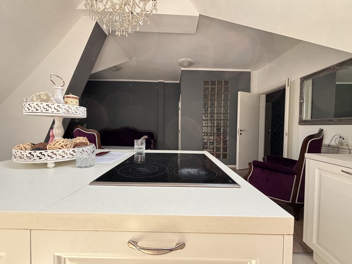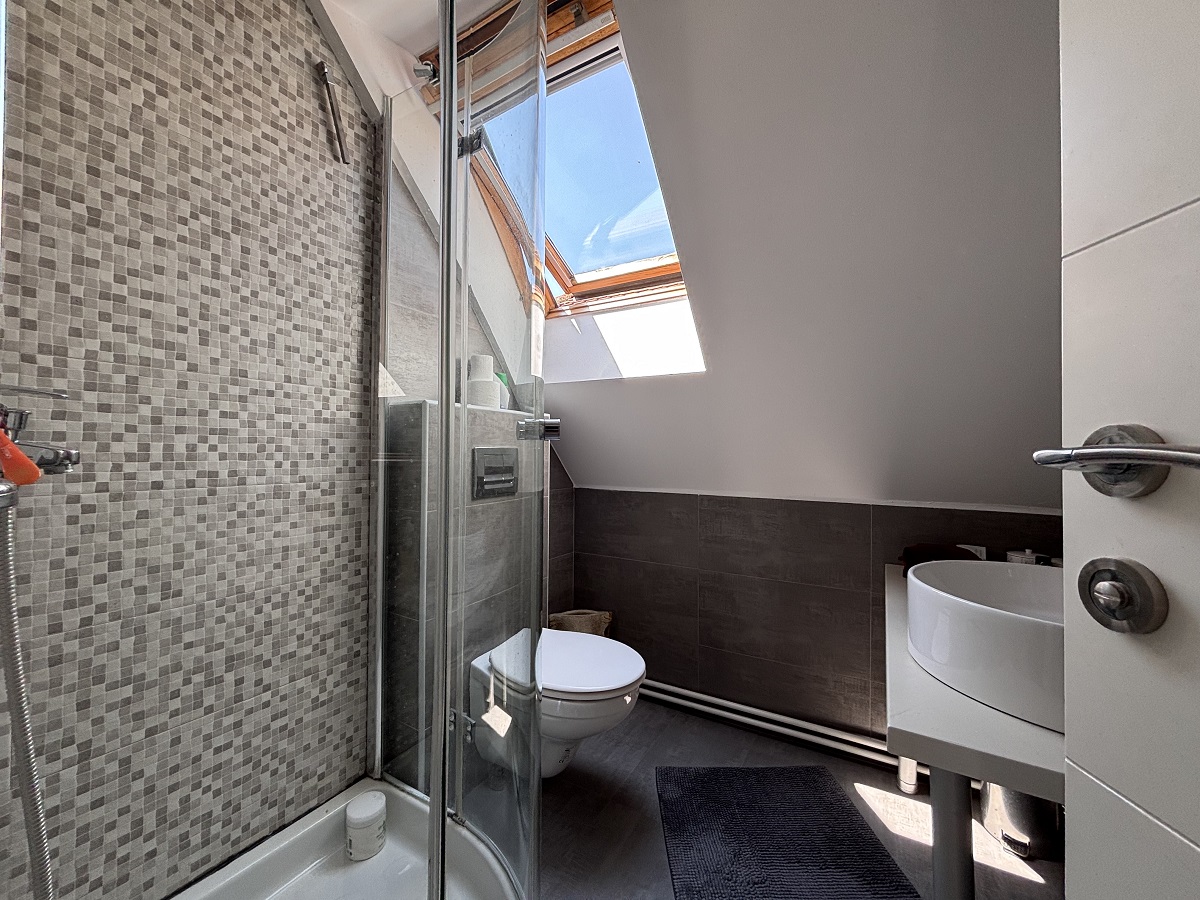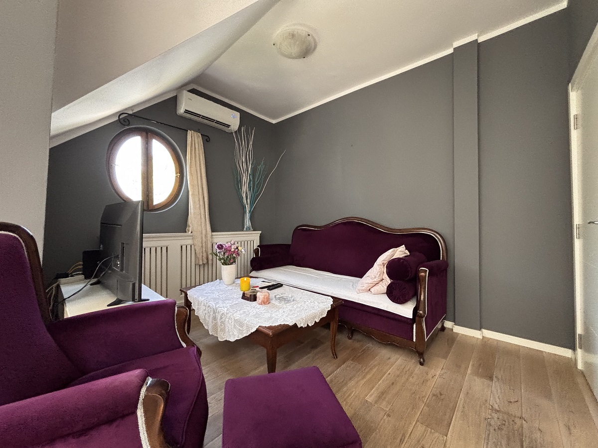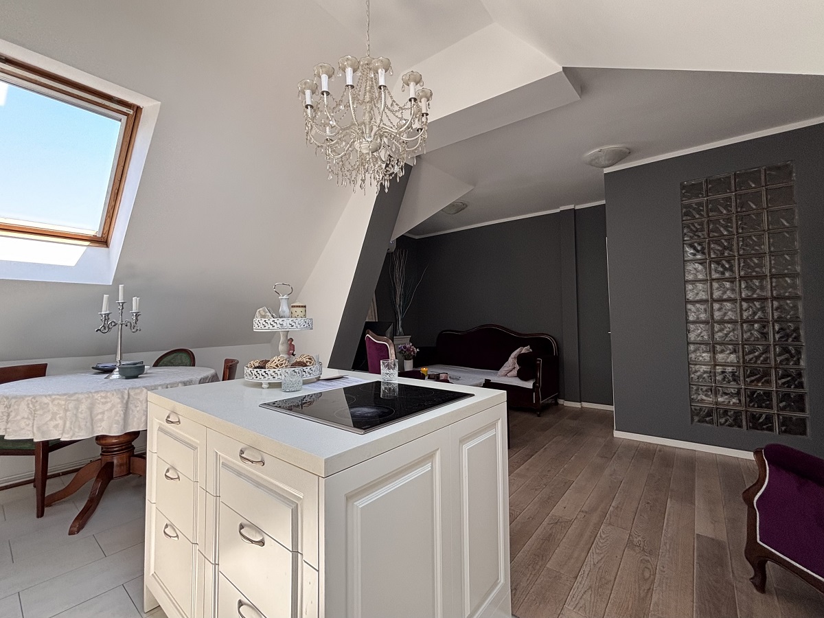 Stan se prostire na dva nivoa. Na donjem nivou nalaze se ulazni hodnik, dnevni boravak sa kuhinjom i trpezarijom, dve spavaće sobe (jedna je trenutno uređena kao garderober), vešernica i kupatilo. Na gornjem nivou je otvoren radni prostor sa ležajem i izlazom na prostranu terasu sa panoramskim pogledom na grad. Stan je izuzetno svetao i poseduje Velux krovne prozore koji su redovno servisirani. Opremljen je nameštajem visokog kvaliteta i svim potrebnim uređajima. Stan poseduje tri klima uređaja, dok je grejanje etažno.