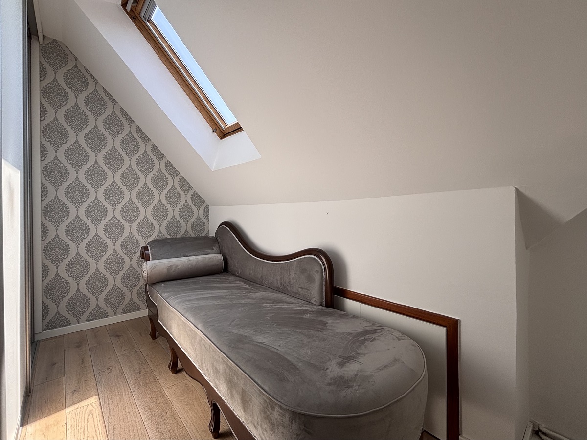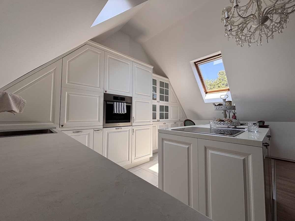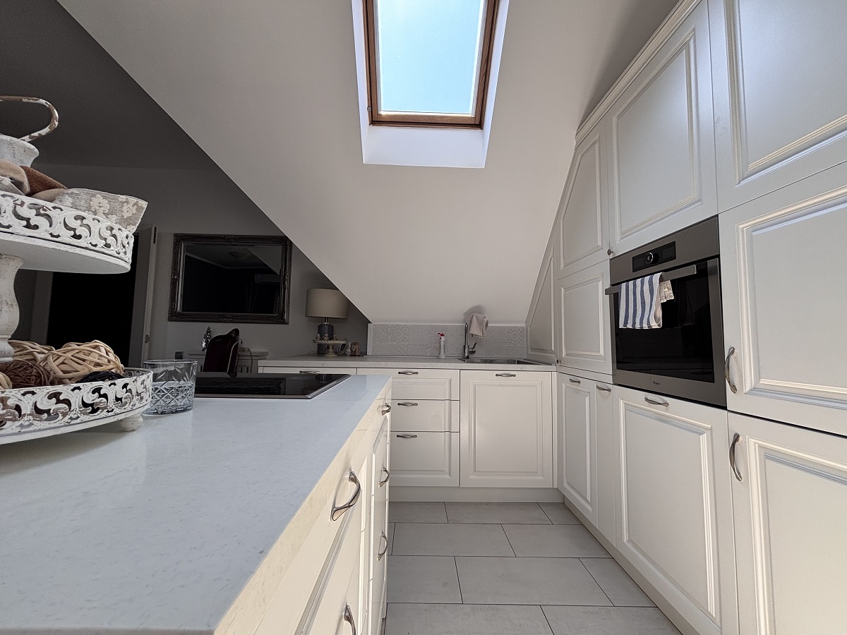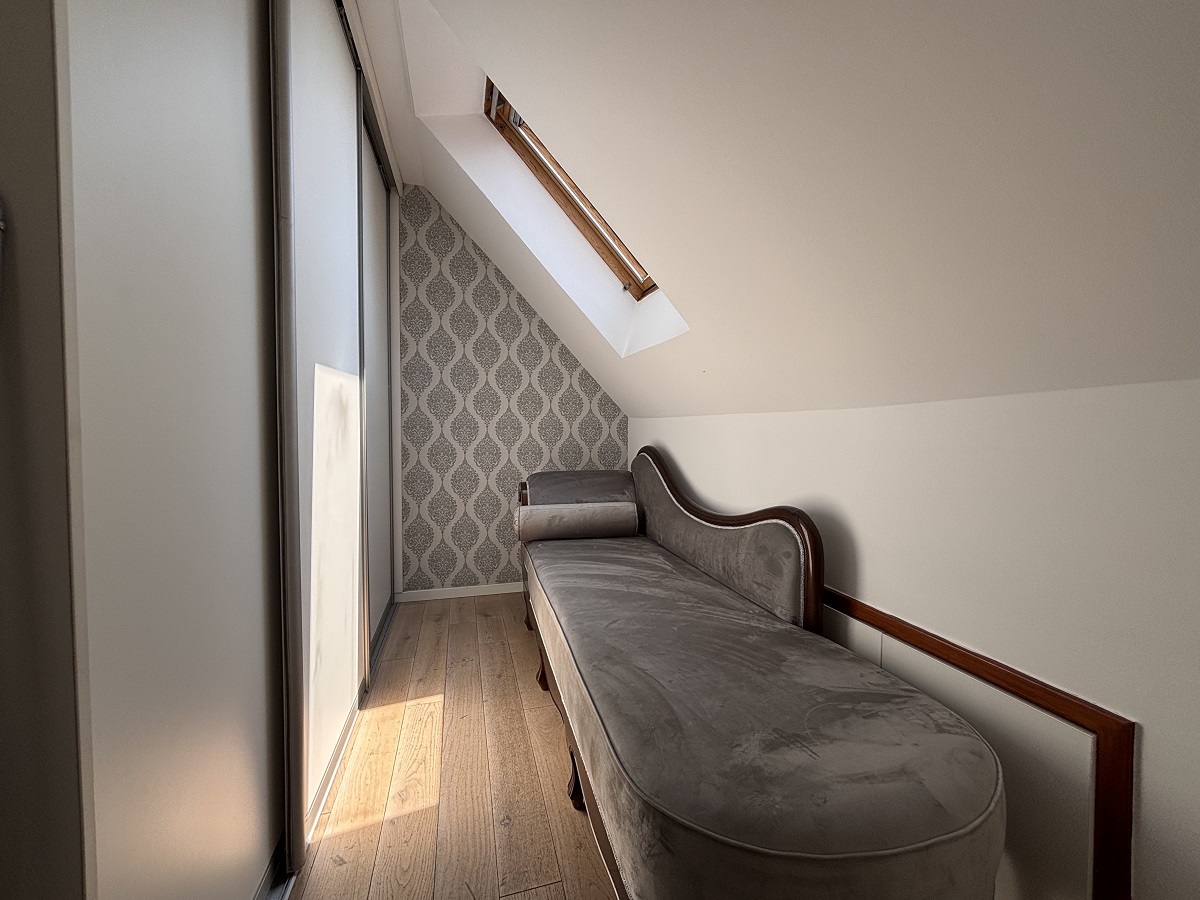 Stan se prostire na dva nivoa. Na donjem nivou nalaze se ulazni hodnik, dnevni boravak sa kuhinjom i trpezarijom, dve spavaće sobe (jedna je trenutno uređena kao garderober), vešernica i kupatilo. Na gornjem nivou je otvoren radni prostor sa ležajem i izlazom na prostranu terasu sa panoramskim pogledom na grad. Stan je izuzetno svetao i poseduje Velux krovne prozore koji su redovno servisirani. Opremljen je nameštajem visokog kvaliteta i svim potrebnim uređajima. Stan poseduje tri klima uređaja, dok je grejanje etažno.